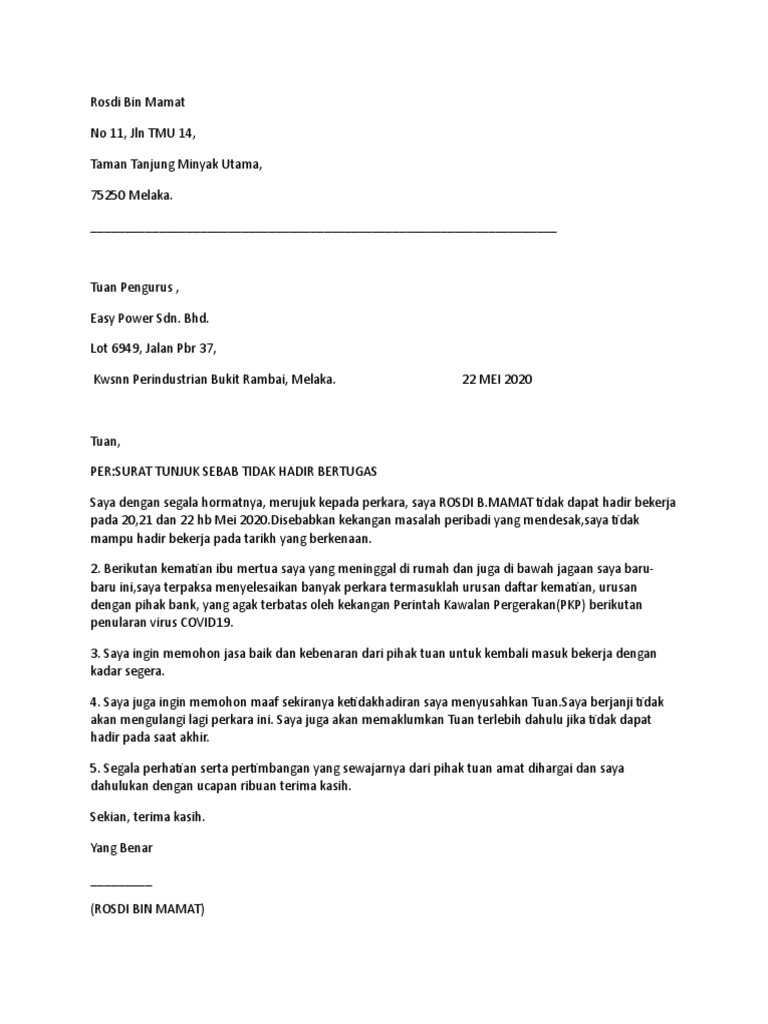 Surat rasmi tidak hadir bekerja info melayu. Berikut anda boleh gunakan contoh surat tunjuk sebab lewat hadir kerja. Surat tunjuk sebab tidak perlu ditulis dengan bahasa yang berbunga. Isi dan matlamat surat dinyatakan. Contoh surat rasmi tidak hadir ke sekolah (sakit, demam, urusan keluarga dan sebagainya). Encik narong oh lai ching, sir, surat tunjuk sebab ketidakhadiran ke kelas lukisan kejuruteraan dengan segala saya merujuk kepada perkara di atas. Contoh surat izin tidak kerja alasan sakit. Berikut adalah diantara contoh contoh surat rasmi pemberitahuan tidak hadir bekerja richard gusang blok t 7 taman sentosa 85300 penampang sabah. Di bawah ini adalah contoh surat tunjuk sebab tidak hadir ke mesyuarat. Format surat tunjuk sebab kesalahan tata tertib. Anda boleh mengubah surat ini mengikut situasi anda sendiri. Jika tidak, email pun boleh. Tan sri abdul khalid ibrahim hari ini menyerahkan surat jawapan tunjuk sebab setelah diminta memberikan penjelasan berhubung beberapa perkara kepada lembaga.