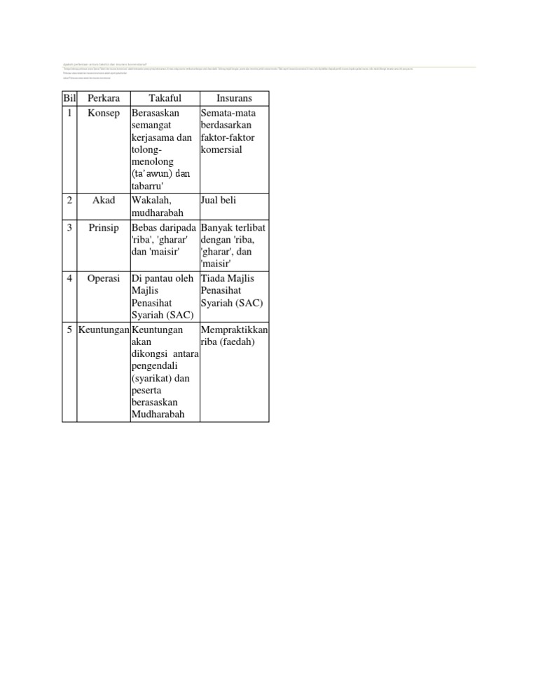 Dari segi pelaburan kumpulan keewangan pula, caruman yang diterima akan hanya dilaburkan dalam instrumen yang memenuhi kehendak syariah. Perbezaan takaful dan insurans by asma_samat in types > business/law. Insurans kapitalis terutamanya insurans hayar mempunyai unsur maisir kerana insured akan dibayar pampasan yang besar dengan sumbangan premium yang sedikit. Sering mendengar istilah ccris dan ctos, namun anda tidak tahu perbezaan istilah tersebut? Mari kita lihat apa perbezaan takaful dan conventional insurance takaful: