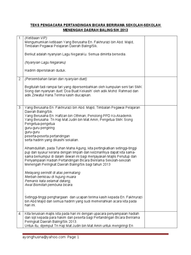 Teks ucapan majlis penutup pertandingan damen hair. Mengumumkan ketibaan yang berusaha encik nordin bin rukani, penyelia unit kokurikulum, pejabat pelajaran daerah pasir gudang. Sebelum ini saya pernah dilantik dan dijemput mengacara beberapa buah majlis formal. Kursus inimembuktikan dan menyedarkan kita bahawa guru bahasa melayulah yang menjadi sendiuntuk mengangkat keupayaan bahasa melayu sebagai alat. 24 oktober 2020 | sabtu. Koleksi teks pengacara majlis hari anugerah kecemerlangan. Yang berbahagia, encik yew kok leh, pengetua smk jalan mengkibol. Untuk mempengerusikan sesi pembentangan ini. Faridah binti omar, penolong kanan pentadbiran, en. Teks pengacara majlis, mc untuk majlis sambutan maulidur rasul peringkat sekolah menengah dan rendah. Majlis persaraan pegawai pendidikan merupakan sebahagian tatacara operasi piawai atau s.o.p. Contoh teks pengacara majlis majlis perkahwinan adha & azwan. Teks pengacara majlis berbuka puasa :