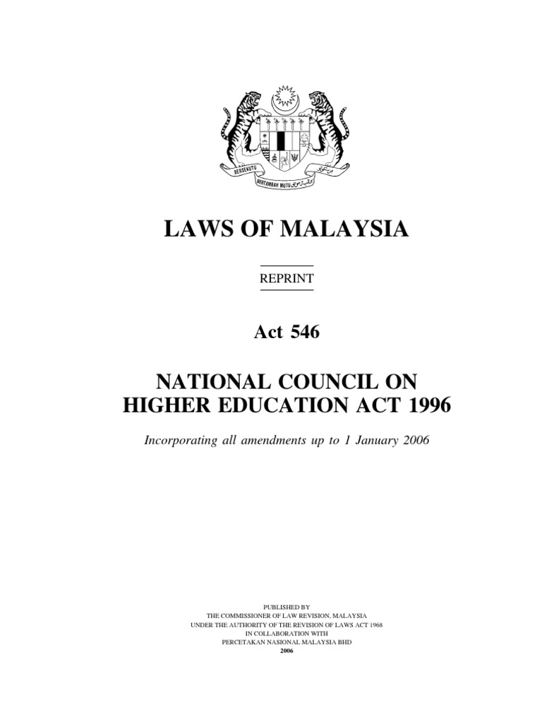 Quality education programs the quality of educational institutions in malaysia is monitored by the malaysian government enforcement of legislation such as the education act, 1996, the private higher educational institutions act, 1996 and the malaysian qualifications agency act 2007. Education act 1996 (act 550) & education (special education) regulations 2013 the objective of education act 1996 to provide education and matters connected with the purpose of education to enable the malaysian society to have a command of knowledge, skills and values that is highly. The education act 1996 (malay: Whereas acknowledging that knowledge is the key determinant of the destiny. Education 13 laws of malaysia act 550 education act 1996 an act to provide for education and for matters connected therewith.