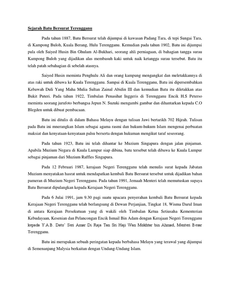 Keajaiban yang ada pada batu bersurat terengganu ialah hanya dengan sebongkah batu bersurat itu terzahir satu tamadun manusia yang. The stone is a testimony to the spread of islam offering an insight to the life of the people of the era as. Batu itu seterusnya dibawa ke surau tok abdul rashid (surau tok ki rashid). Atas dasar itu, bukti atau pertanda asas jati diri ini boleh dilihat daripada batu bersurat terengganu (bbt). Ia menunjukkan bagaimana islam diterima di peringkat roh, akal, jasad dan.